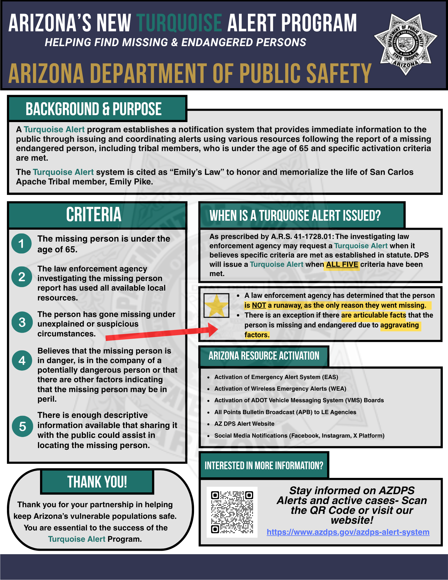 The Turquoise Alert system is cited as “Emily’s Law” to honor and memorialize the life of San Carlos Apache Tribal member, Emily Pike.